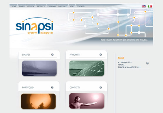 Progettazione e realizzazione del sito internet di Sinapsi system integrator, progettazione di sistemi di automazione, messa in servizio di impianti fino al chiavi in mano. Il prodotto di punta dell'azienda è E-Solar il rivoluzionario sistema di monitoraggio e la gestione della manutenzione locale o remota di impianti fotovoltaici fissi o ad inseguimento.